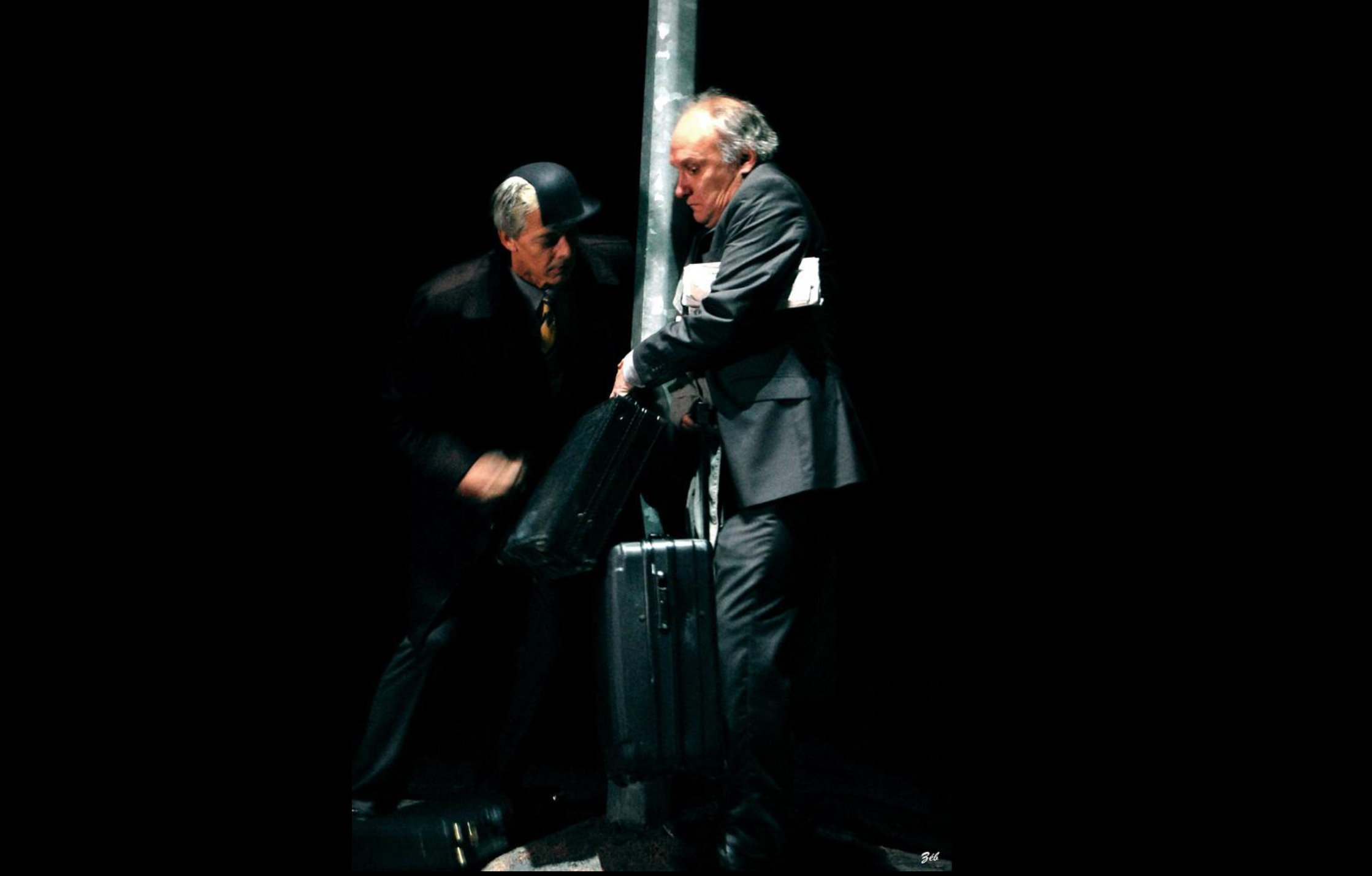 Au bord d'une départementale déserte, perdus au milieu de la nuit, deux commis voyageurs attendent leur bus. Ils s'observent, se jaugent et se jugent. Mais à minuit, tout va bientôt disparaître. Il ne leur restera alors qu'un peu de lumière pour se départager et attendre le bus.